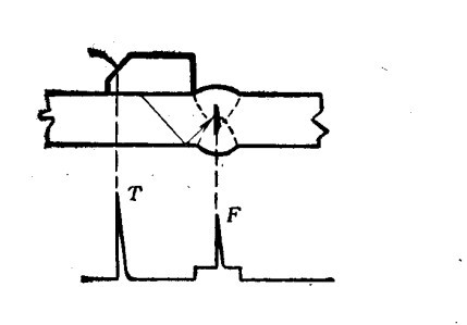 (二)四探頭法 四探頭法可探測厚度為4~12毫米的薄板對接焊縫中的裂紋、未焊透、條狀夾渣等缺陷。而且還可以進(jìn)行探傷儀自動探測。四探頭法為兩組探頭(T為發(fā)射探頭,R為接收探頭),用機(jī)械固定并分別放在焊縫兩側(cè)(距焊縫軸線距離相等),探傷時沿焊縫同時移動。探測縱向缺陷時,T1R1為一組探頭,T2R2為一組當(dāng)焊縫中無缺陷時,熒光屏上只出現(xiàn)焊角反射波。如有缺陷,則在焊角反射波之前出現(xiàn)缺陷波F(如缺陷在焊縫中間,則兩組探頭所得缺陷波重疊在一起),探頭移動時,缺陷波的幅度改變。