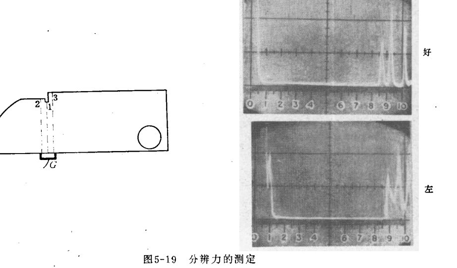 六、分辨力的測定 下圖探頭在G位置,可測定分辨力。探頭移動,使之在85、91和100刻度處獲得三個回波。如果三個波是分離的,則分辨力好。否則,分辨力差。