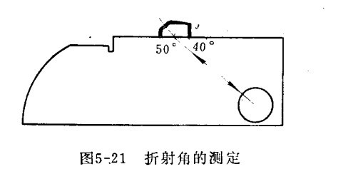 八、折射角的測定 如下圖示,探頭在J位置,移動超聲波探傷儀探頭,直到獲得從有機玻璃圓柱塊處反射回的波幅最高為止,此時探頭零點線在試塊上所指的角度即為其折射角度(入射點至有機玻璃圓柱塊中心的連線與零點線的夾角),試塊上刻有幾個固定的折射角。
