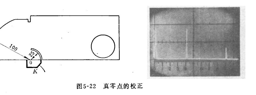 九、斜探頭真零點的校正 斜探頭聲波經(jīng)過有機玻璃延遲一段時間后,射入工件,這一段時間需在熒光屏零點刻度上予以校正。如下圖示,探頭在K處移動,直到獲得從100毫米弧度反射回的波幅最高為止,然后調(diào)整掃描線的“水平位移”及“細調(diào)”,使兩個反射波出現(xiàn)在40°及90°處為止??潭?0°的波系從100毫米處直接反射回探頭的波(路徑200毫米),而90°處的波系由100毫米處及25毫米槽處往復(fù)反射回至探頭的波(路徑450毫米)。此時,熒光屏的零點刻度即為聲波離開斜探頭有機玻璃楔塊時的零點。