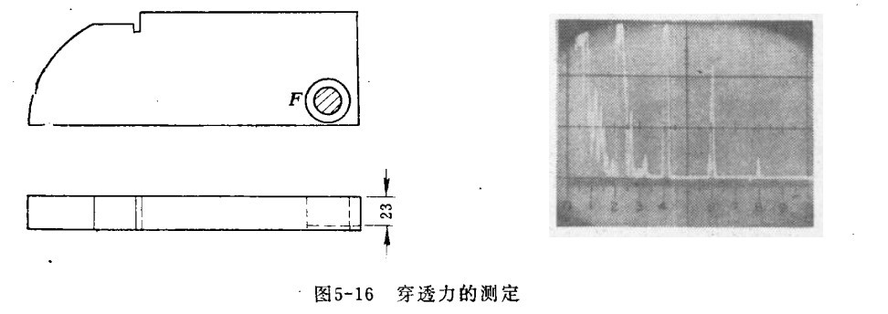 三、放大器線性的測定  如下圖所示,將超聲波探傷儀探頭放在F位置的有機玻璃塊上探測,有機玻璃的厚度相當(dāng)于50毫米鋼的厚度。測定時,靈敏度的控制由最小開至最大,高穿透力儀器有6~10個反射波,低穿透力的儀器只有2~4個反射波。