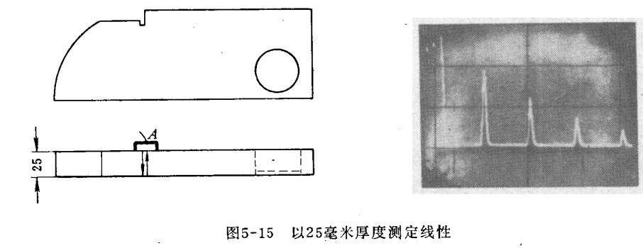 二、時間基線(掃描線)線性的測定  用直探頭(縱波)測定,發(fā)射波調(diào)整在熒光屏的零點上。例如時間基線為0~100毫米時,將探頭放在試塊的A位置,以25毫米的多次反射波進行校正。微調(diào)掃描速度,使第一次反射波出現(xiàn)在25處,如果掃描線性好,第二、三、四次應(yīng)分別與50、75、100刻度重合。否則多次反射波不成比例的出現(xiàn)在熒光屏上。